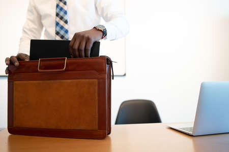 Businessman carrying a stylish leather briefcase in a contemporary office space. Concept of corporate lifestyle and professional business environment.
