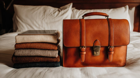 Stylish briefcase placed on hotel bed with folded clothes and tablet