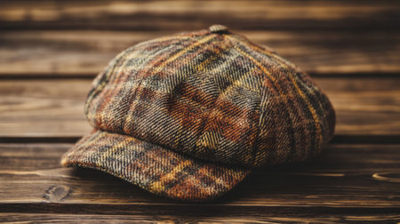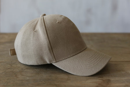 Stylish cap on light wooden background