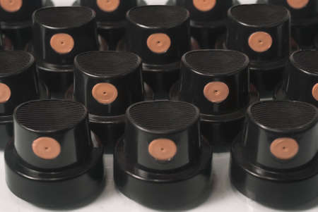 New clean caps from cans aerosol paint for graffiti standing on a table close-up.