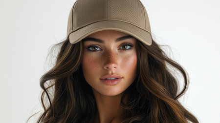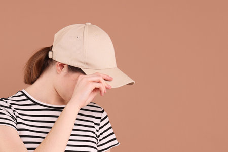 Woman in stylish baseball cap on beige background. Mockup for design