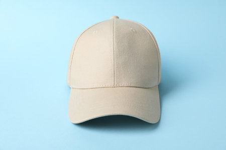 Beige baseball hat on light blue background, closeup. Mockup for design