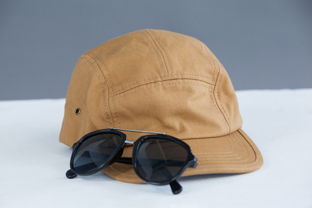 Close-up of brown cap with sunglasses against grey background