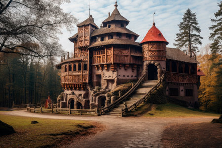 gothic revival villa with pointed roofs and battlement detailing, created with generative ai