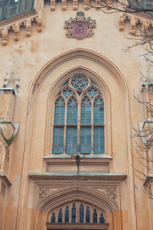 Gothic facade with ornate arched windows shows medieval architecture and craftsmanship