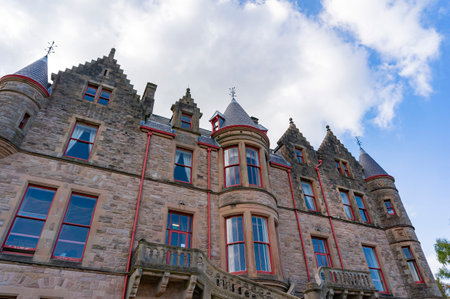 Historic stone mansion facade with gothic architecture and lush greenery.