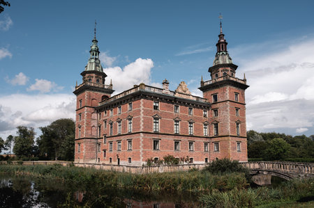 The exterior facade of castle Marsvinsholm with its to towers and the surrounding moat on a warm summer day