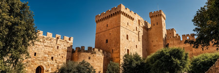 close-up of crenels and merlons on a sandstone battlement, created with generative ai