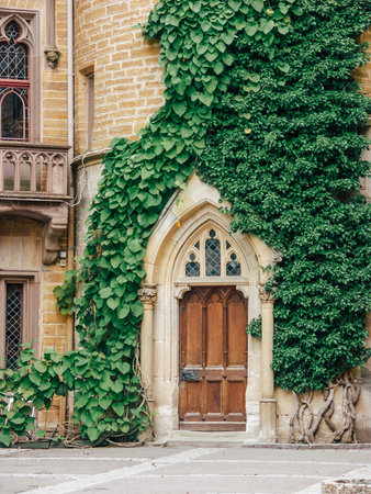 A large brown building with ivy growing up the side. The ivy is green and covers the entire side of the building. The front door is wooden and has a metal lock