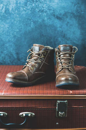 Female legs shod in Hiking boots and an old suitcase. Travel concept