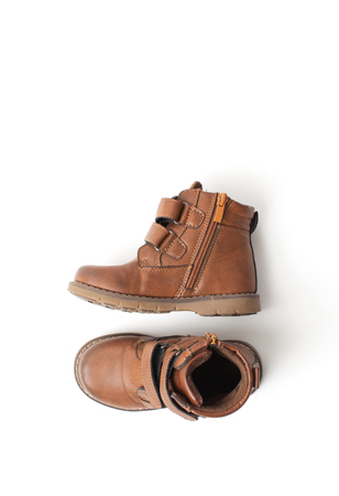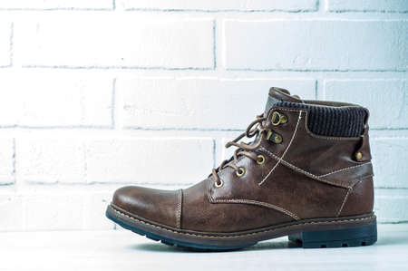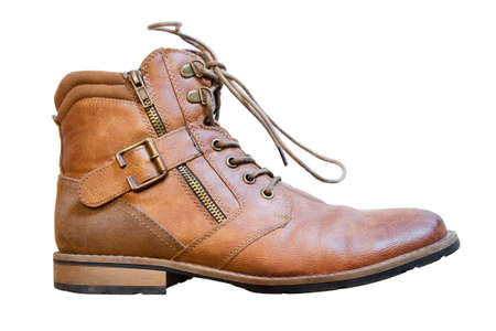close up of the side of a pair of brown mens leather boots isolated on white background