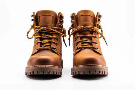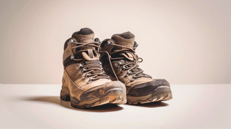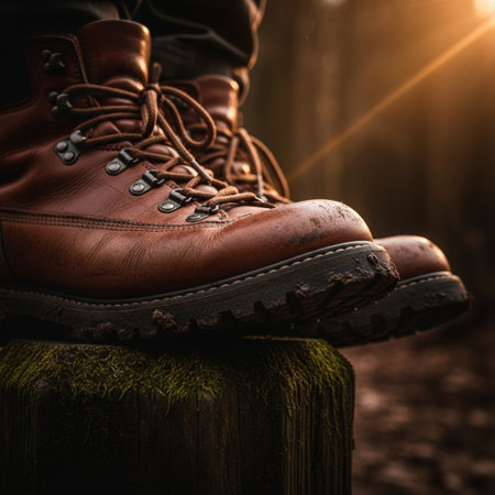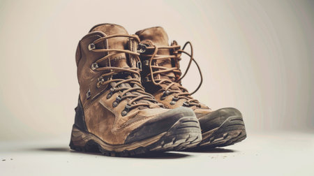 A pair of rugged men s hiking boots are prominently displayed, emphasizing their sturdy design suited for challenging outdoor adventures and trails. Ideal for nature enthusiasts.