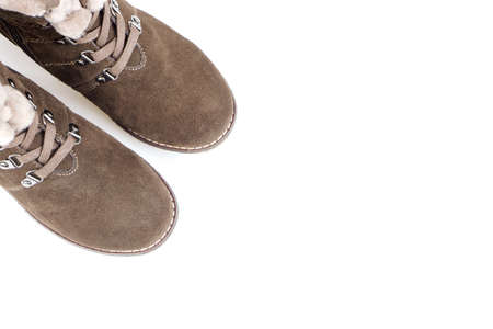 Brown suede women's boots with a thin high heel on a brown background. Fashionable women's shoes made of natural materials.