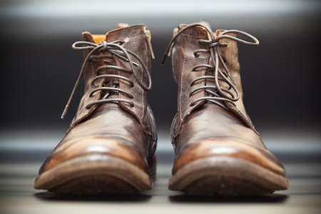 Fashionable brown boots on a dark wooden background. Vintage style.