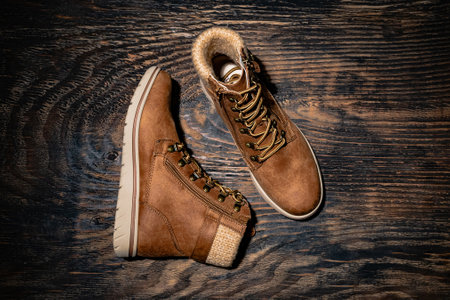 Brown boots. Trendy boots on wooden background. top view, flat layout. fashion concept. Stylish casual shoes for the city.