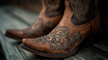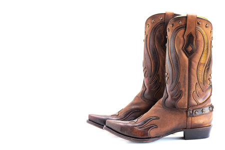 Western elegance in footwear. Classic handmade cowboy boots with decorative details on a white background.
