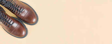 Brown shoes. Trendy Boots Pair on Neutral Beige Background. Copy space, top view, flat lay. Shoe sale, fashion concept. Stylish Casual shoes for city. Overhead shot of chelsea boots. Urban lifestyle