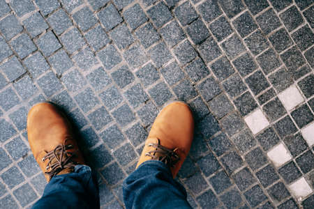 Man feet in brown boots and blue jeans stand on the cobblestones. Close-up