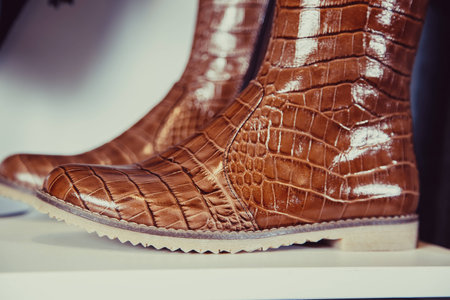 pictured are brown stylish boots and accessories. It can be a suitcase, bag or gloves. Background in color shoes.