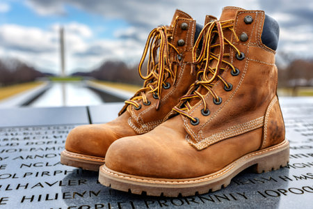 Leather work boots sit on granite wall of world war ii memorial, washington monument reflecting in pool in background