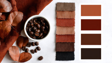 Selection of warm autumnal colors is displayed against a white background. Coffee beans and autumn leaves are positioned beside the color swatches. The image is well-composed, showcasing a harmonious color scheme and natural elements.