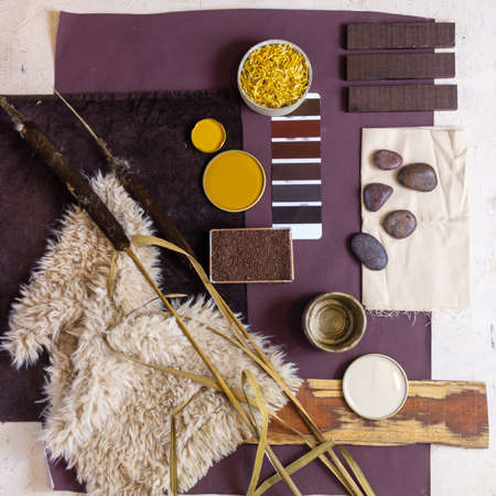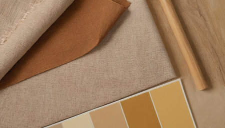 Top view of beige, brown and beige color palette samples on wooden table