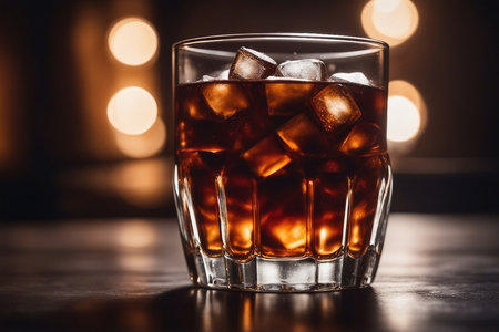 Glass of whiskey with ice cubes on a dark background with bokeh