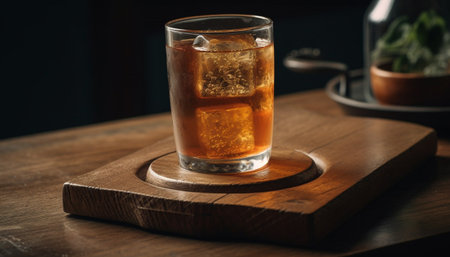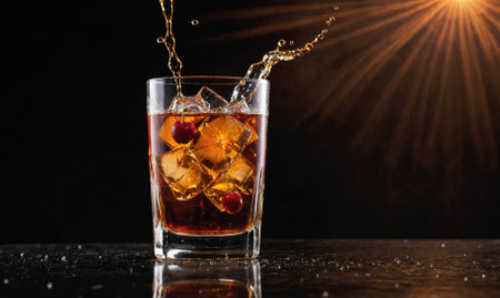 A glass of whiskey with ice cubes on a dark surface, illuminated by a warm light