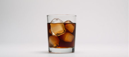 Chilled glass of cola drink with ice cubes isolated on dark background.