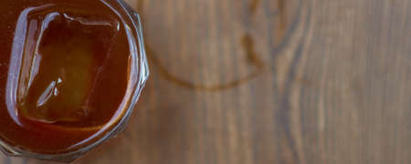 A glass of coffee on wooden background. Iced americano in cafe. Cool summer drinks. Whiskey coctail, coffee-based alcohol cocktails and long drinks serve.