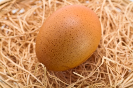 A chicken egg lies in a shipping box and is sold at the supermarket. decorative egg
