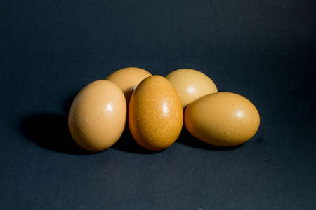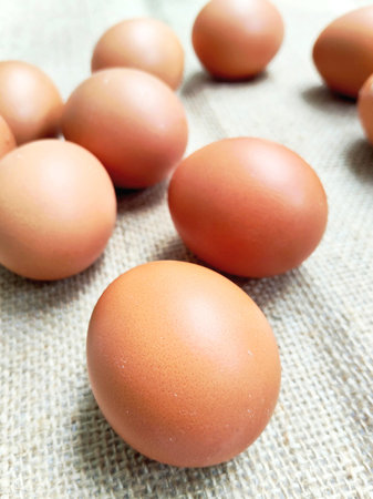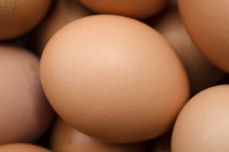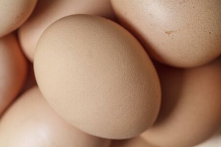 Brown chicken eggs in a chicken eggs pile, egg surface, a select focus close up photo image on a surface of chicken eggshell present a detail of texture and pattern on an eggshell