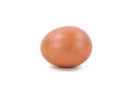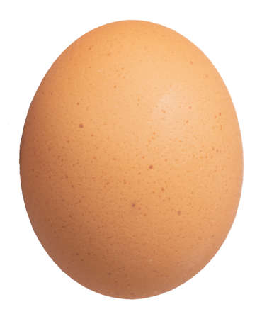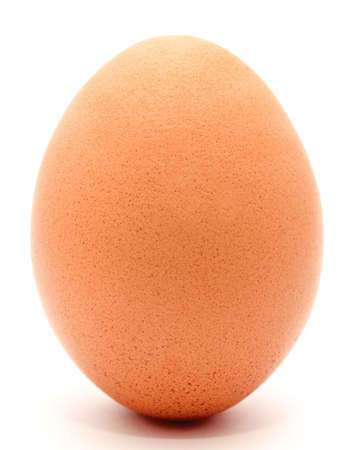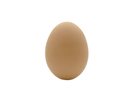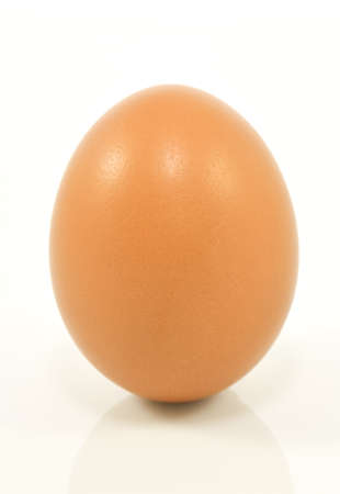 A single brown chicken egg stands vertically on its end, isolated on a plain white background. The studio shot shows the egg's smooth, speckled shell and oval shape with perfect lighting.
