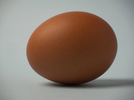 A brown egg rests on a neutral background, accompanied by soft lighting and a gentle shadow. Ideal for food-themed projects, recipes, or culinary designs.