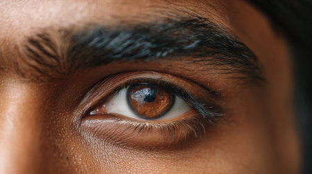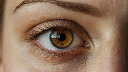 Close-up of human eye with reflections in amber iris and detailed eyelashes. That the image is generated using AI.