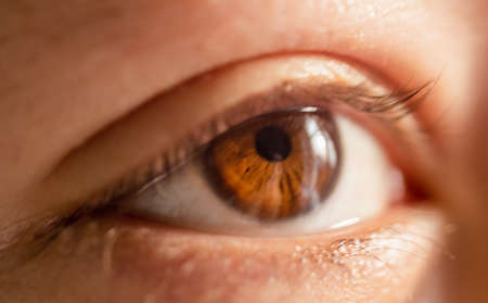 Close-up human eye, lens, cornea and brown iris. Eye health prevention. Examination symptoms disease by eyeball. Beautiful human eye. Look in oneself person thinking genetics and color scheme eye.