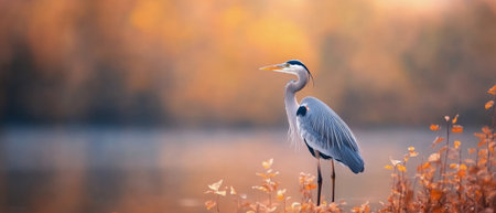 A great blue heron stands gracefully in a field covered with orange and yellow fallen leaves. The soft golden light of early morning enhances the tranquil atmosphere.
