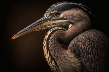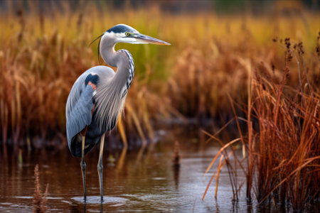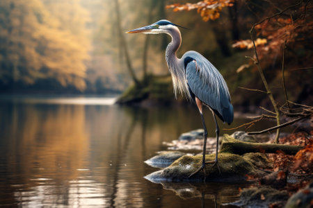a beautiful blue heron gracefully stands in the water, captured in the style of evocative environmental portraits reminiscent of whistlerian and national geographic photography. the image showcases the heron's elegance against a backdrop of organic stone carvings, reminiscent of the works of david nordahl. the color palette of orange and gray adds a captivating touch to this creative commons attribution photo. ai generated