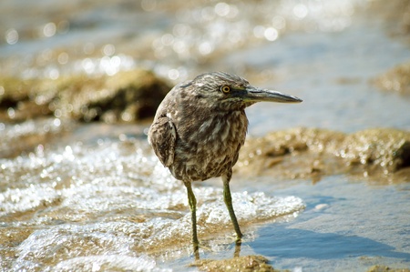 purple heron(Ardea purpurea) on a beach in Phuket Thailand hunting fish.