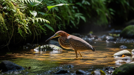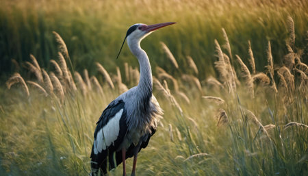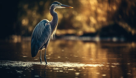 A majestic heron stalks fish in a vibrant, restored wetland at sunset This stunning image embodies wildlife sustainability and ecosystem protection The heron's hunt highlights the delicate balance of a thriving habitat, showcasing the success of conservation efforts and the importance of wetland biodiversity AI Generative