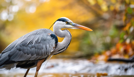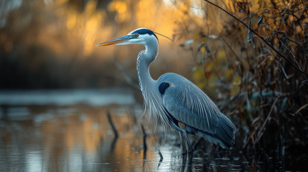 A heron stands gracefully near colorful autumn foliage, illuminated by the warm glow of the sunset. The detailed plumage contrasts against the vibrant orange and yellow leaves.