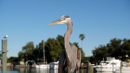 Indian Rocks Beach, Florida. A great blue heron is guarding the dock, watching with intensity.
