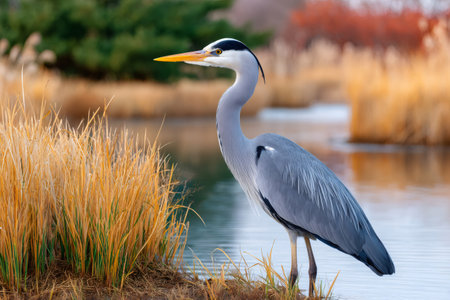 Gray heron standing on bank near water and golden reeds, looking for prey