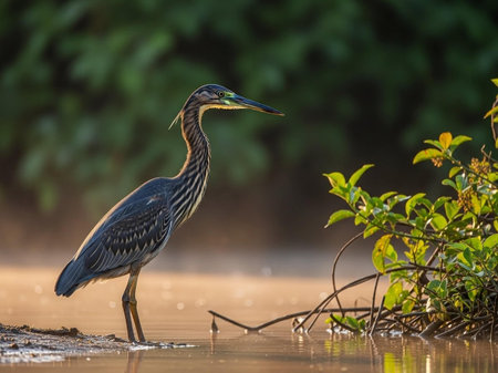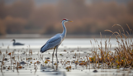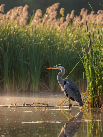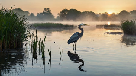 Majestic heron standing in serene misty wetlands at sunrise. That the image is generated using AI.