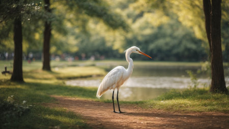 Great white egret standing on a path in a park in the summer