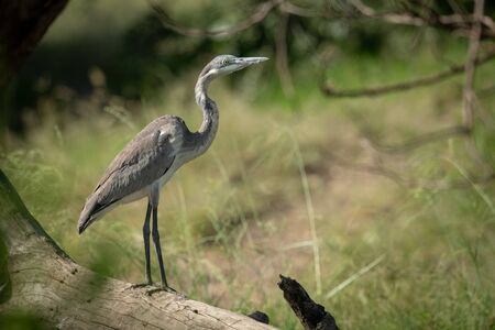 Black-headed heron stands on log looking right