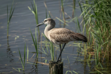 Hamerkop bird perched on wooden post by water