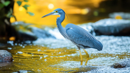 A graceful heron standing in a shallow river, its long legs and sleek body perfectly adapted for wading in the water.
