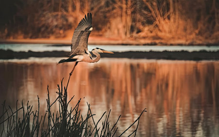 Great Blue Heron in flight over a lake in the fall.