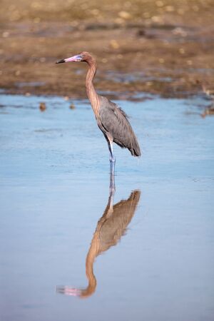 Reddish heron Egretta rufescens with its reflection in the Myakka River in Sarasota, Florida